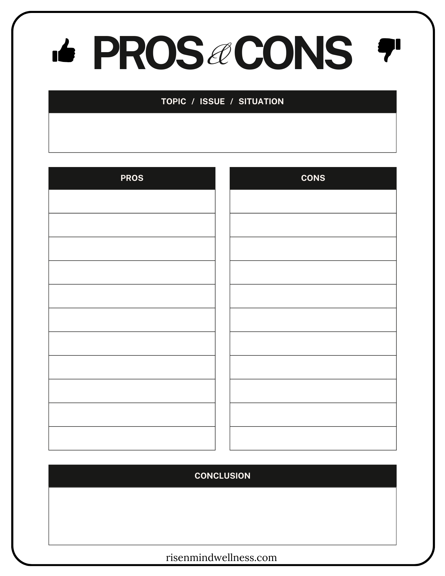 Pros & Cons Chart Mar 21 Written By Risen Mind Wellness This downloadable PDF is a Pros & Cons ChartClick here to download the PDF file.Or save the image for a PNG file. Risen Mind Wellness https://risenmindwellness.com